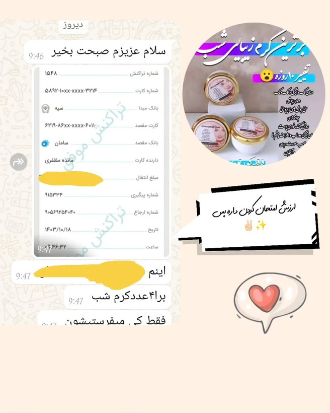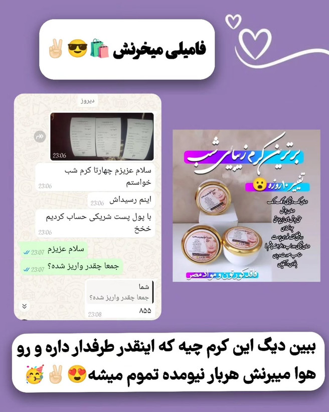 این کرمو بزن پوستت از این رو به اون رو میشه مخصوصا اگر تیرگی لکجوش داری بیوتی کرم شب ما کاملا گیاهیه فاقد کوروتون و مواد مضره جواب دهی سریع داره نسبت به خیلی محصولات دیگ پوست رو خیلی روشن و صاف میکنه تیرگی هارو کامل ازبین میبره جوش رو ازبین میبره پوست رو صاف میکنه کسیو نداشتیم ک از این کرم ناراضی باشه ارسال به سراسرکشور با پست پیشتاز